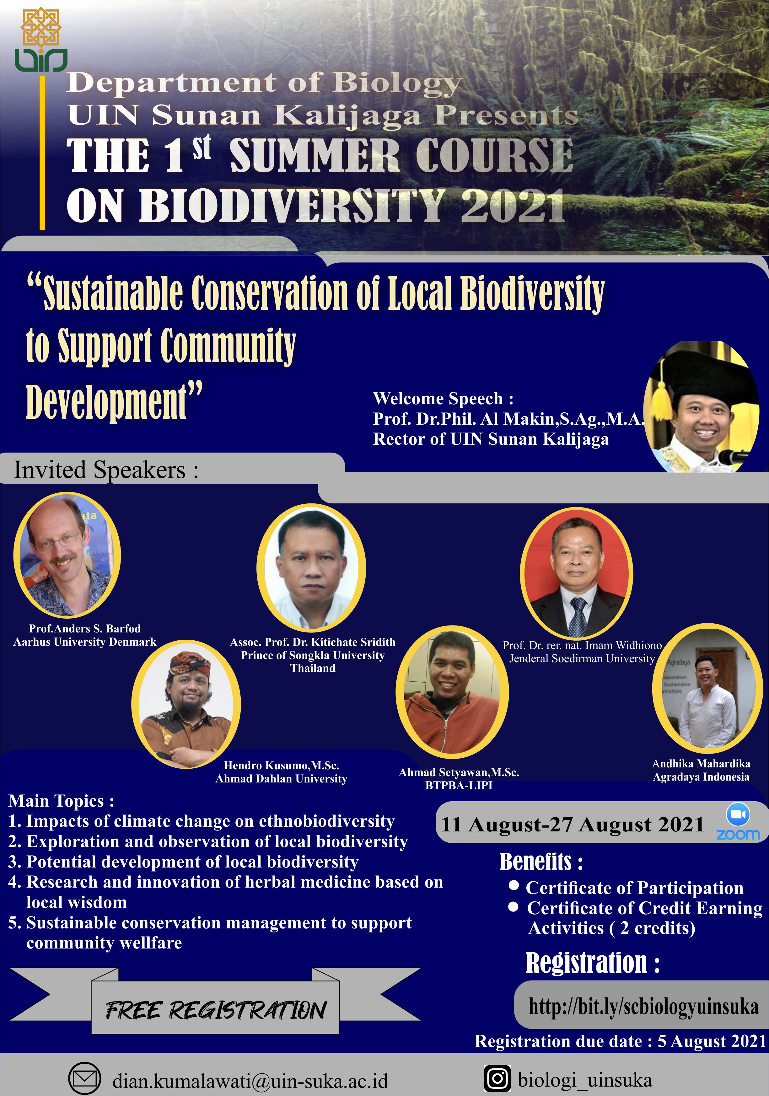 Call for Summer Course Participation – the Summer Course 2021 on Sustainable Conservation of Local Biodiversity to Support Community Development. Department Biology, UIN Sunan Kalijaga, Yogyakarta, Indonesia Tuesday, 27 Jul 2021 15:40:04 WIB Viewed : 661 times Download